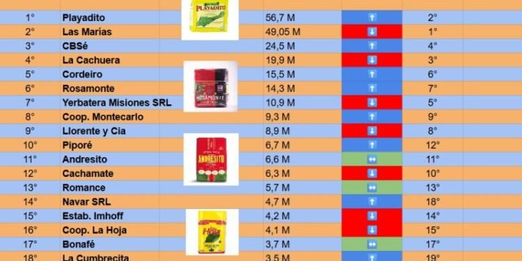 According to figures obtained from the National Institute of Yerba Mate (INYM), which were shared with the publication Plan B, the remainder of the top ten comprised notable players like CBSé (3rd), La Cachuera (4th), and Cordeiro (5th), among others.